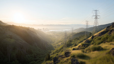 Sunrise over valley with power lines and city skyline in the distance