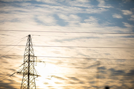 Electricity pylons and wires in the evening sky. The concept of electricity.