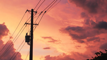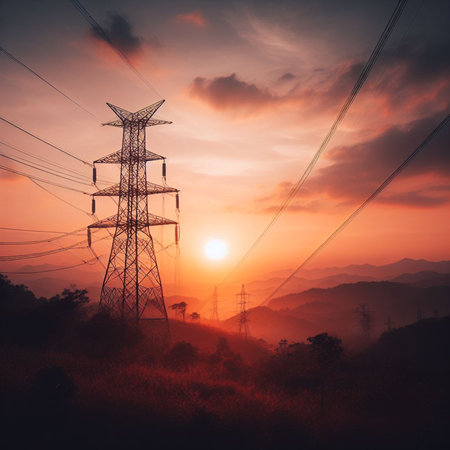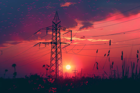 High-voltage pblems tower against the sky at sunset, power grid concept. High contrasting colors, stock photo, --chaos 30 --ar 16:9 --v 6.1 Job ID: fefbc0d2-9743-4ff9-b5c7-e09e92230f48