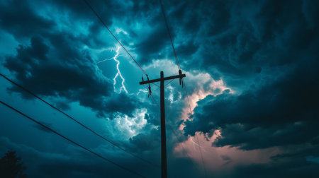 A dramatic shot of a utility pole against a stormy sky, with dark clouds and lightning in the background, conveying the power and unpredictability of weather