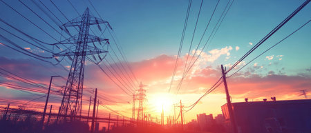 High-voltage pblems tower against the sky at sunset, power grid concept. High contrasting colors, stock photo, --chaos 30 --ar 16:9 --v 6.1 Job ID: fefbc0d2-9743-4ff9-b5c7-e09e92230f48