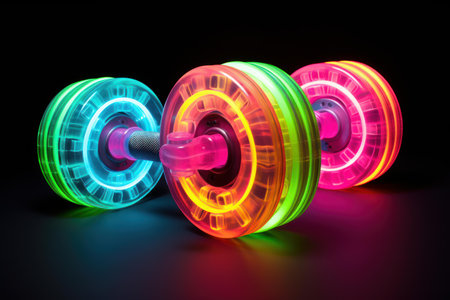 Luminous neon-lit dumbbells in pink, green, and orange hues, isolated on a black background
