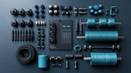 A collection of gym equipment and weights are displayed on a blue surface. Concept of organization and dedication to fitness