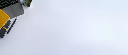White office desk with laptop, notebook, coffee cup and succulent plant. Flat lay.