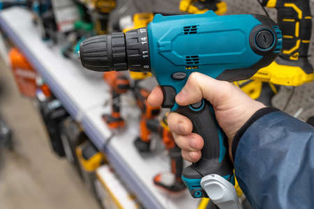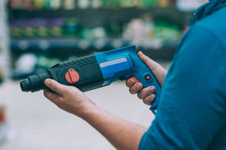 A man holds an electric drill in his hand for drilling. A buyer in a hardware store selects a product