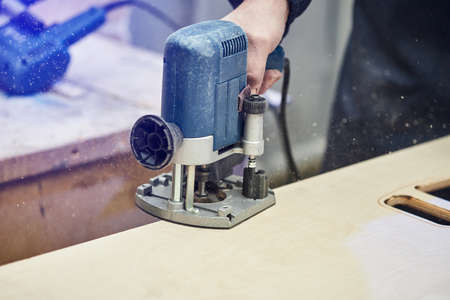 Сarpenter working with milling machine. Joinery, woodworking and furniture making, professional carpenter cutting wood in carpentry workshop, industrial concept.