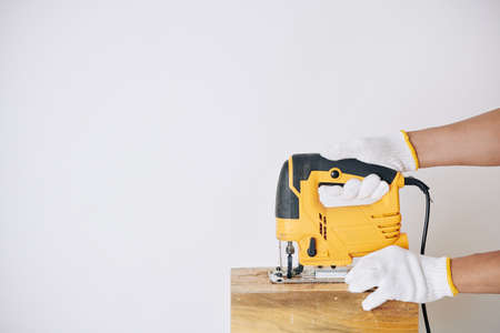 Close-up image of carpenter in protective gloves cutting wooden plank with electric jigsaw
