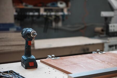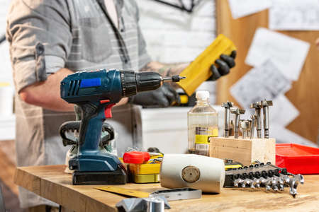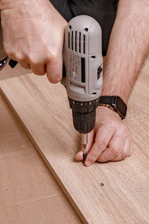 Caucasian mans hand holding an electric screwdriver. Man assembles furniture at home. Housework. Close-up. Vertical shot