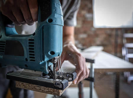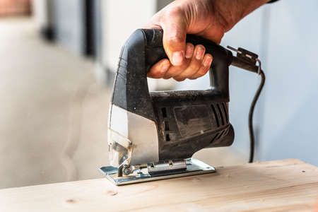 Close up on hand of unknown carpenter working with an electric jigsaw cutting wood with saw woodworking hobby concept