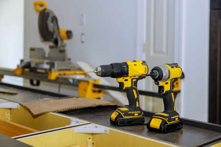 Two cordless drills with drill bits working also as screwdriver guns on drill instrument professional tool as woodworker