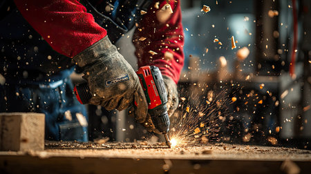 A skilled worker uses a powerful electric drill, producing sparks and wood shavings in a dynamic workshop environment. This image captures craftsmanship and energy in action.