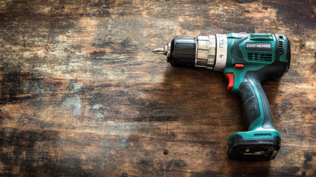 Yellow cordless drill rests on a dark textured surface. Powerful tool for construction and DIY projects
