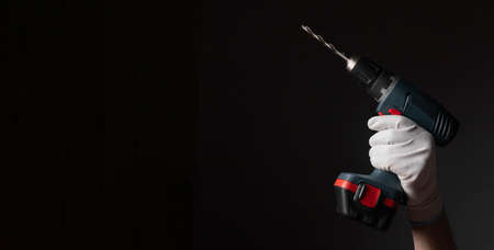 Electric drill. Power tools. The hand uses a drill to drill a hole in the wall. Repair. Construction