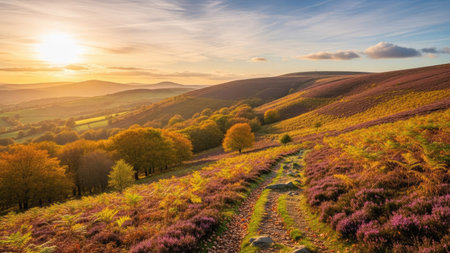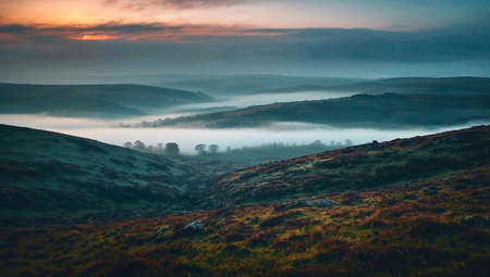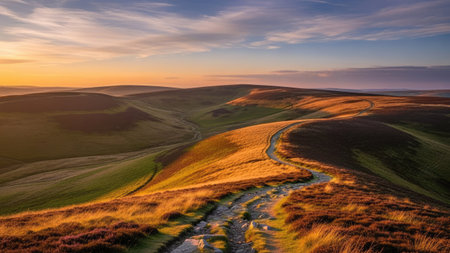 Beautiful sunrise over rolling hills in the Peak District National Park, UK