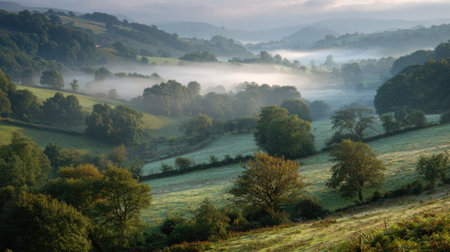 Soft mist rises over lush green hills as dawn breaks creating a serene valley scene.
