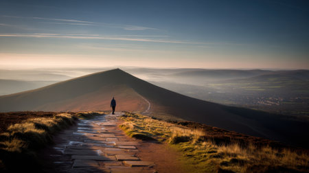 A lone person walks along a scenic mountain path at dawn or dusk. The warm light illuminates the vast landscape, creating a sense of peace, adventure, and solitude.