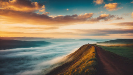 Experience the stunning beauty of a sunrise illuminating a misty valley. The vibrant colors reflect over foggy hills, creating a tranquil and picturesque scene.