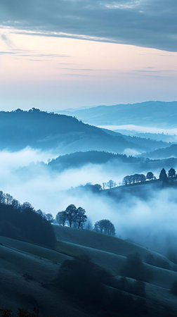 Gentle rolling hills are shrouded in soft mist, with layers of valleys receding into the distance under a pale sky.
