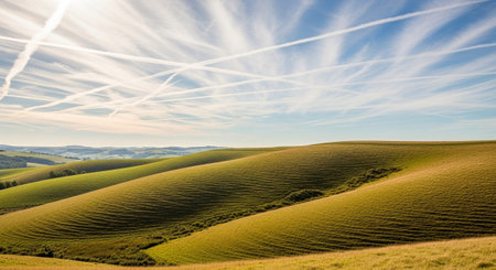 Streaks showing rolling green hills with textured grass and wispy cloud streaks in the sky. resolution