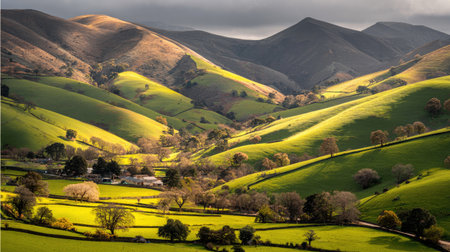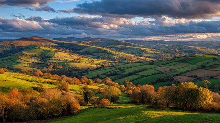 This captivating landscape captures the beauty of rolling green hills adorned with vibrant autumn foliage, bathed in warm sunlight under dramatic clouds.