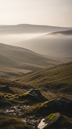 Misty rolling hills bathed in soft morning light with green grass and moss-covered rocks in the foreground creating a serene natural landscape.
