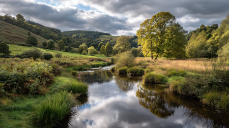 A serene river flows through a lush countryside, reflecting the dramatic sky above. This tranquil landscape showcases the beauty of nature in a peaceful setting.