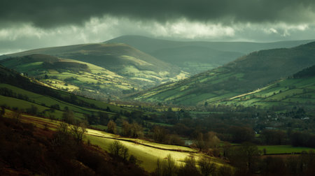 This stunning image showcases vibrant green valleys and rolling hills beneath a dramatic sky. Ideal for nature lovers and landscape enthusiasts seeking tranquility and beauty.