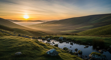 Sunrise over a stream on the rolling hills of the Yorkshire Dales National Park