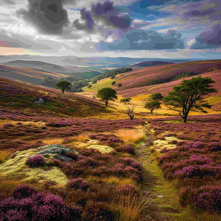 Landscape with blooming heather in the Peak District National Park
