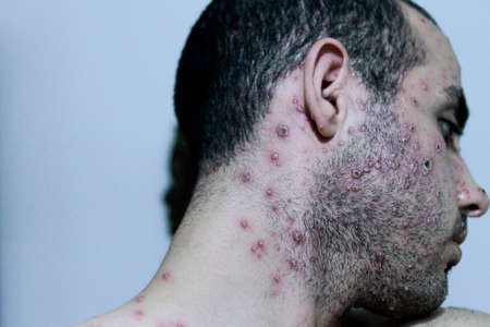 Adult man half face with aggressive varicella. Varicella or Chicken pox on adult man. Adult man face with varicella