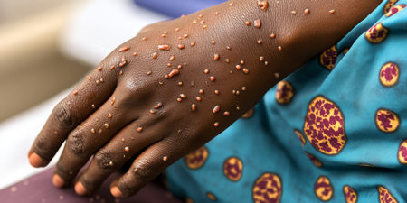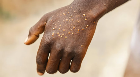 The image prominently displays a human hand exhibiting clear signs and symptoms of a monkeypox infection, which is characterized by raised lesions that are visibly noticeable on the skin surface