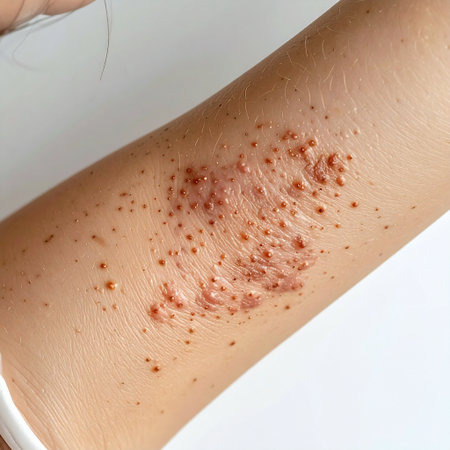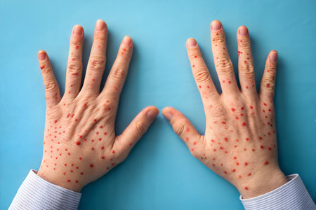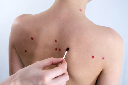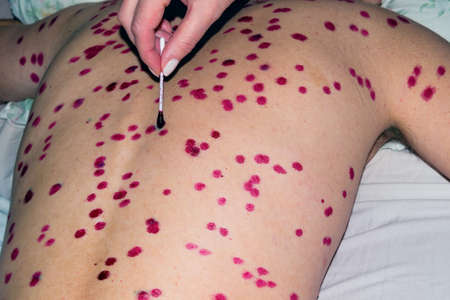 A close-up view captures a healthcare professional gently examining a patients back, which is marked by numerous red spots, indicating a possible skin condition. The gloved hand delicately touches the skin, highlighting the importance of care and attention in medical assessments, while the soft, neutral background suggests a clinical environment.