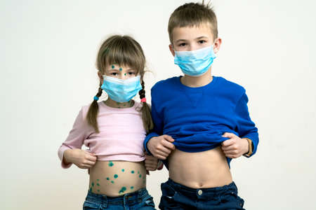 Boy and girl wearing blue protective medical mask ill with chickenpox, measles or rubella virus with rashes on body. Children protection during epidemic of coronovirus. Covid-19 contagion concept.