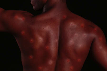 Male back affected by blistering rash because of monkeypox or other viral infection on white background
