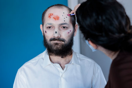 Wife helping man prepare for halloween, dressing him as devil frightening zombie. Woman applying fake blood wounds and scars makeup on husband, turning him into horror creature