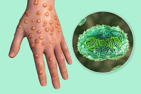 Hand of a patient with monkeypox infection, 3D illustration. Monkeypox is a zoonotic virus from Poxviridae family, causes monkeypox, a pox-like disease