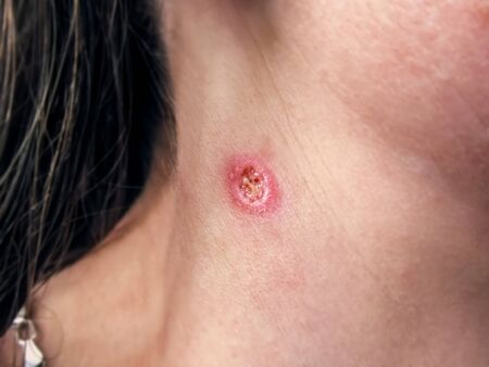 A wound on a woman’s neck after burning a wart, close-up. Round painful hole in human skin, purulent wound