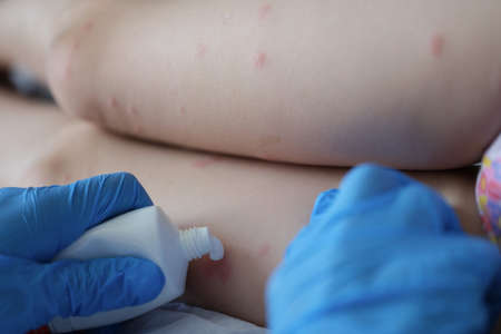 Doctor in rubber gloves applying cream to red rash of child closeup
