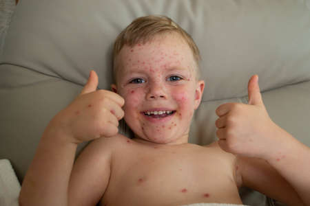 A boy aged 8 years old is gesturing OK. Chickenpox virus. Skin rash in a child. Varicella pox