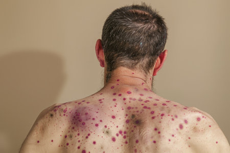 Close-up of a male shoulder with monkeypox rash showing inflamed red lesions. Mpox viral symptoms during the outbreak.