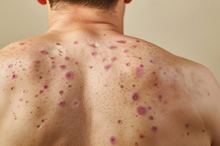 Back rash: skin condition with red spots on human back.