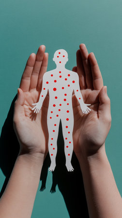Hands cupping a paper figure covered with red spots, representing the monkeypox virus. Focus on virus transmission and public health