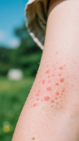Skin damaged by insect bites. Close up. Skin with many red spot and scar from sand fly bites