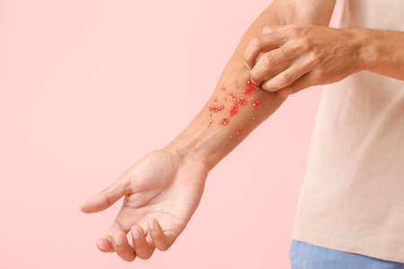 Man ill with monkeypox scratching his arm on pink background