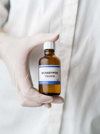 Monkeypox virus vaccine in bottle holds nurse in hospital with white gloves professional photography 2022