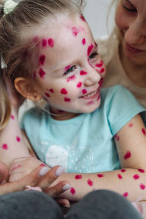 Child portrait with chickenpox. Sick little girl with varicells making eruption on skin. Long home quarantine, then having immunity for ever.