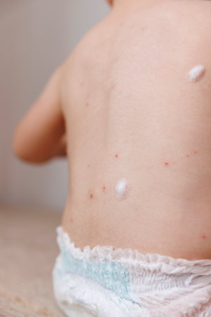 Closeup of toddler boy's back with chickenpox illness spots