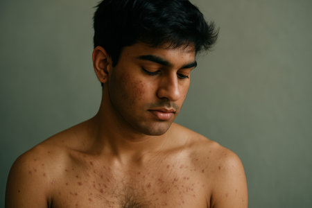 Young man with closed eyes showing acne and blemishes on face and chest against plain background, conveying vulnerability.