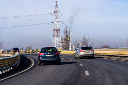Car traffic at rush hour. Traffic jam, cars on the road at sunset in Bucharest, Romania, 2021