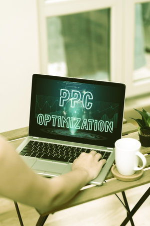 Conceptual display Ppc Optimization. Business approach Enhancement of search engine platform for pay per click Hand Busy Typing On Laptop Beside Coffe Mug And Plant Working From Home.